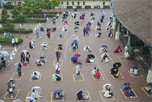 Visitors in facemasks lined up to enter Tokyo Disney Resort on July 1. The resort reopened for the first time in four months after being closed due to the coronavirus. [Photo/Xinhua] |