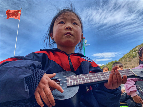 A girl learns how to play ukulele in the school's playground. [Photo provided to China Daily] |