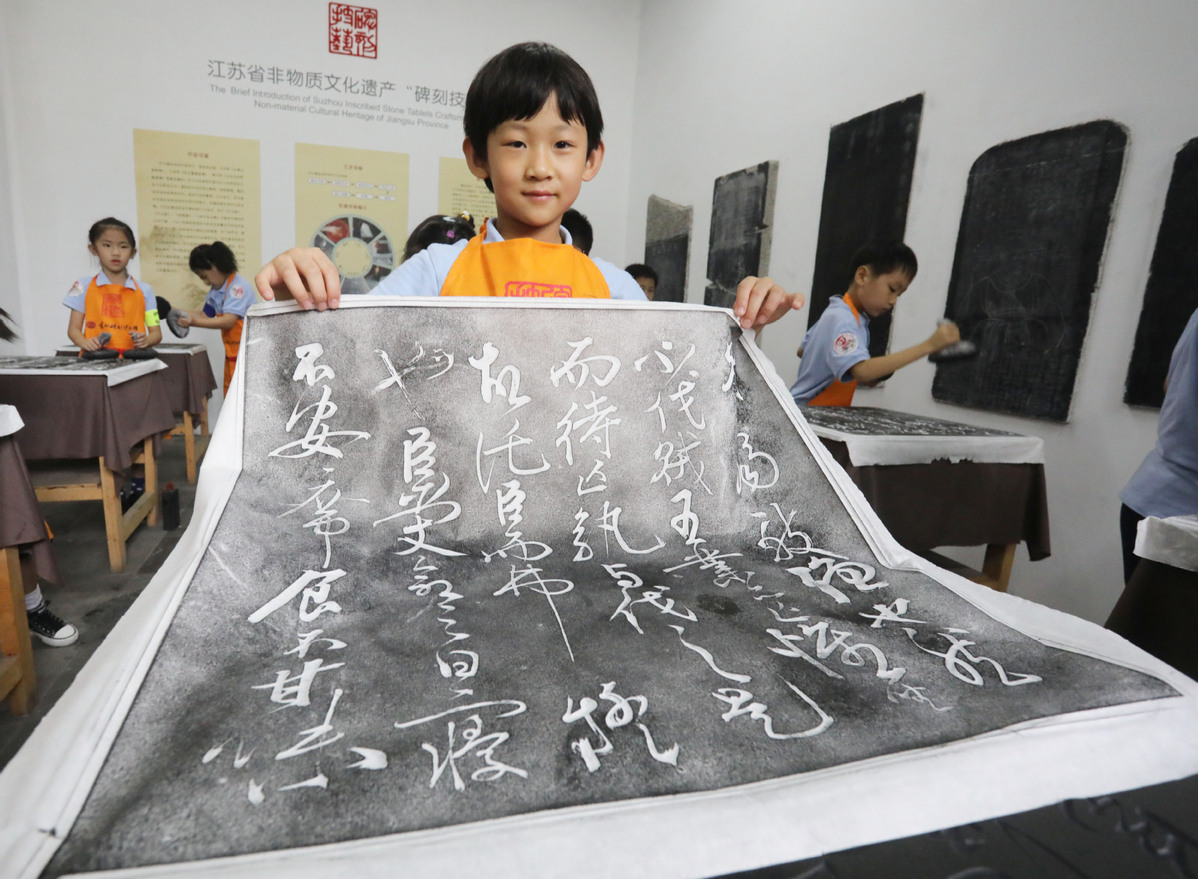 A primary school student tries out inscriptions at the Suzhou Museum of Inscribed Stone Tablets in Suzhou, East China's Jiangsu province, on July 7. Rubbings from inscribed stones are used to make "copies" of texts carved on stone tablets. More than 30 primary school students visited the museum to experience the art of traditional Chinese culture. [Photo/Xinhua]