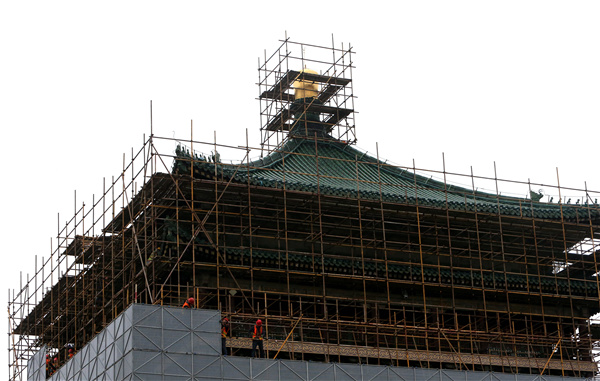 The tower undergoes renovation on June 23. Admission for the general public was suspended until Aug 25. [Photo by Shang Hongtao/For China Daily] |