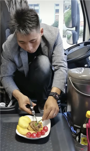 A screenshot of Shi Chuanhai, a truck driver from Suzhou, Jiangsu province, preparing delicious food in his vehicle. He has posted more than 200 videos online of his culinary skills since last year. [Photo provided to China Daily]