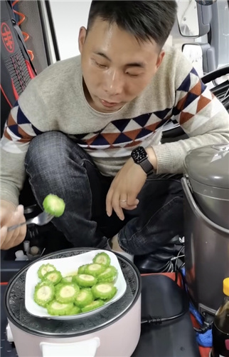 In a video this month, Shi tries fried fish in his cab. Using a pair of scissors to cut and gut the fish, he marinates it and then puts it in a pan with onions. Then he adds garlic, and red pepper flakes in oil.