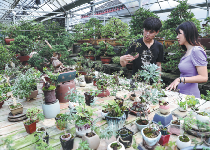 With bonsai trees of various shapes and birds chirping in the garden, Wang Guangming skillfully attaches a twig to the branch of a pine tree before covering it with some cling wrap.
