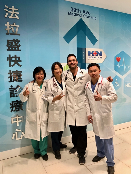 Zhang Jin (second left) with her colleagues at the HealthNeed Medical Urgent Care in Flushing, New York.[Photo provided to China Daily] |