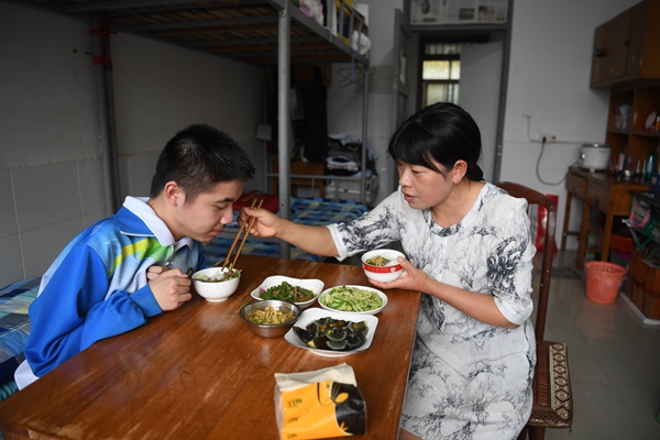 Cheng and his mother have lunch in the school dormitory.[Photo/Xinhua] |