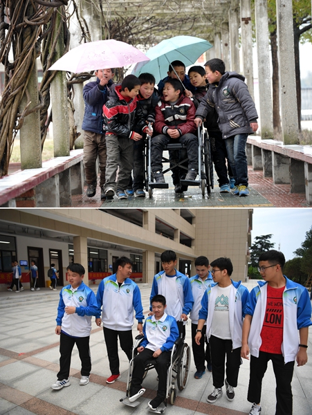 Before and after photos of Cheng Dongdong in the company of his support group from his elementary and high schools taken in 2012 and 2020.[Photo/Xinhua]