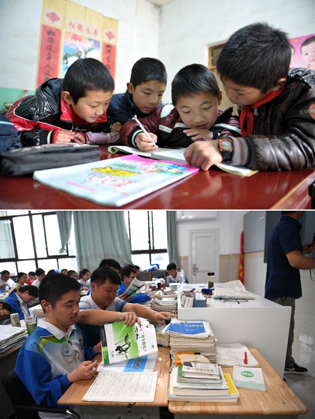 Classmates help Cheng with his lessons in 2012 and 2020.[Photo/Xinhua]