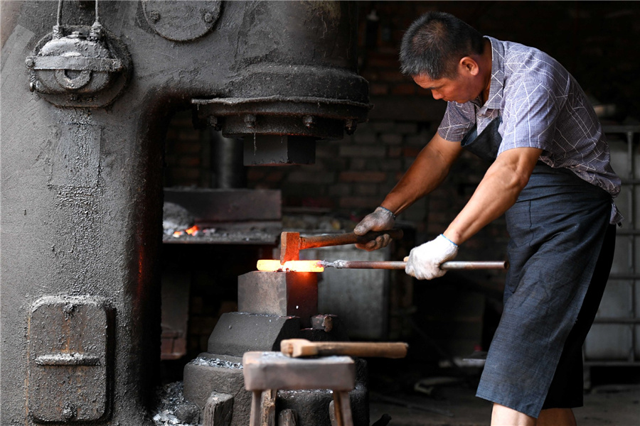 Blacksmith Li Zhujun, best known for creating riffled-iron swords, demonstrates this traditional technique in his studio in Xingtang, North China's Hebei province, on July 7. [Photo/Xinhua]