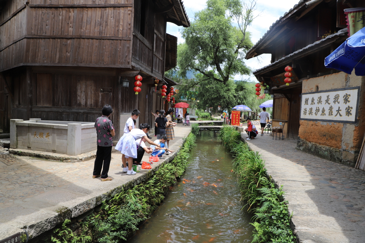 Local children feed carp from a bank of the brook in Puyuan village, East China's Fujian province. [Photo by Huang Qiqing/for chinadaily.com.cn]