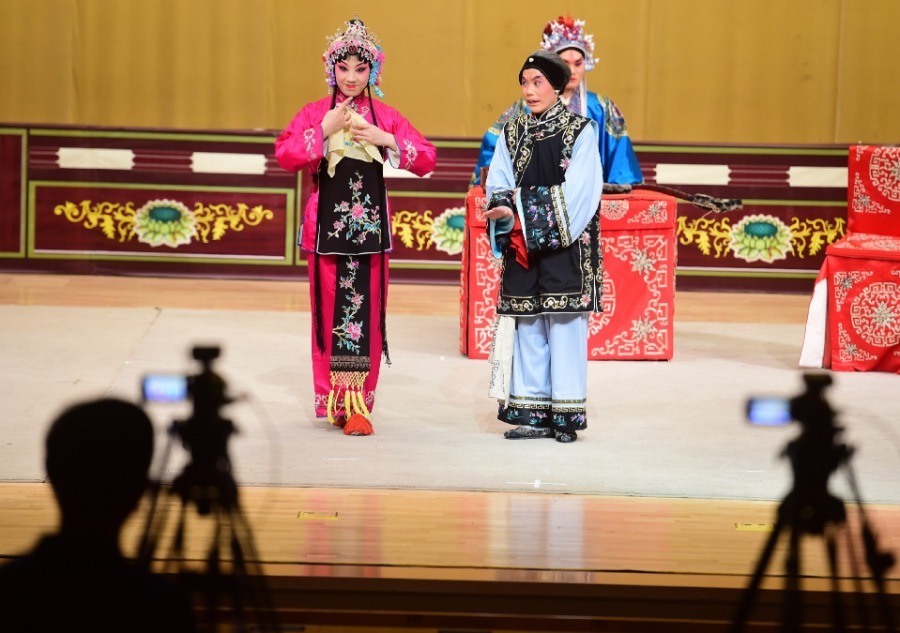 Actors perform Peking Opera in Cangzhou, North China's Hebei province, July 14, 2020. An online show featuring 40 Peking Opera classics was recently held by the Cangzhou Peking Opera Troupe, gaining popularity among fans of traditional Chinese opera.[Photo/Xinhua]