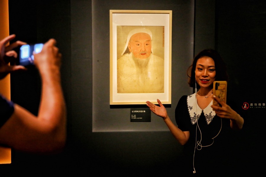 Media reporters introduce the show to people at the portrait exhibition on July 16.[Photo by Jiang Dong/China Daily]
