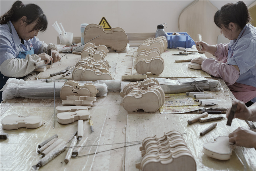 In Donggaocun, Beijing Pinggu East China Musical Instruments, established in 1988, is the largest violin manufacturer in North China. Its production includes violin, viola, cello, bass and erhu. Liu Yundong, the representative in charge, says:"In the past, every three violins in the world came from Donggaocun village. Each violin was worth only 100 to 200 yuan ($28.6), and 80 percent of them are low-end products. We have shifted our production focus on developing fine musical instruments. Now a Pinggu violin can be sold for up to 70,000 or 80,000 yuan, and the improvement in quality is naturally favored by high-end customers."