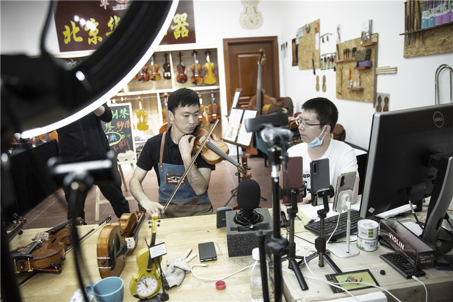 The violin sales have plummeted due to the COVID-19 pandemic. Lu Zunfei (left), a luthier, and his colleagues start live broadcast to promote domestic sales. [Photo by Qin Bin/For China Daily] |