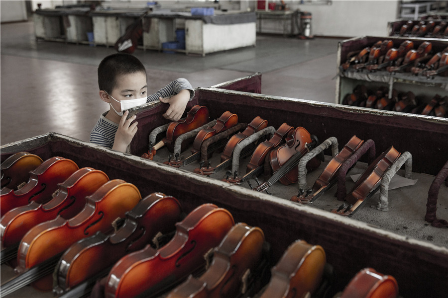 A little boy looks at the finished violins in the workshop. [Photo by Qin Bin/For China Daily] |