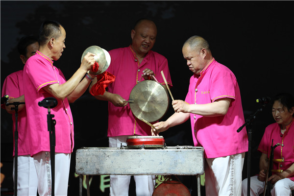 Lu Shuiping (cymbal), Li Qi (gong) and Ma Xingping (drum). [Photo by Zou Hong/China Daily] |