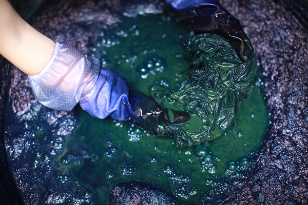 She puts tied cloth into a vat full of the herb to dye.[Photo provided to China Daily] |