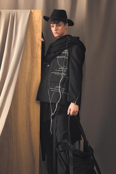 Inspired by the mood, this color tone was adopted into my collection. As far as texture, the bundle of threads are intertwined and trussed up, offering a sense of tattered messiness. The environment is entangled by the threads, similar to the fission in the follower's mind. The inlay stitches inspired me to create the shabby look of cloth. In addition, the embellishments such as raw edge trimming and embroidery are implied in my collection.