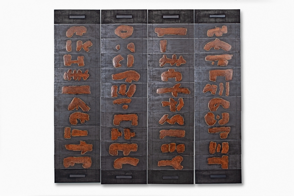 Besides lacquer, Cazeneuve is also recognized for his exploration of a wide range of materials and integrating them with metal, natural fibers and leather. The 15 artworks on exhibition feature a combination of lacquer with materials such as ramie fabric, gold leaves, Moso bamboo and used rice bags.