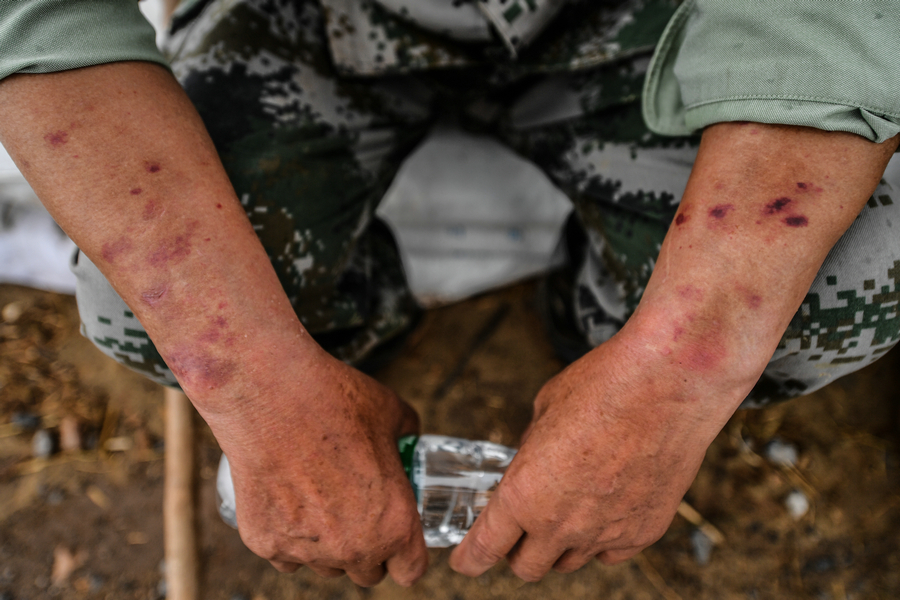 Chen Shentao's hands are covered with itchy red bumps by mosquitoes.[Photo/Xinhua] |