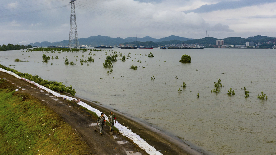 The father and son patrol an embankment together.[Photo/Xinhua] |