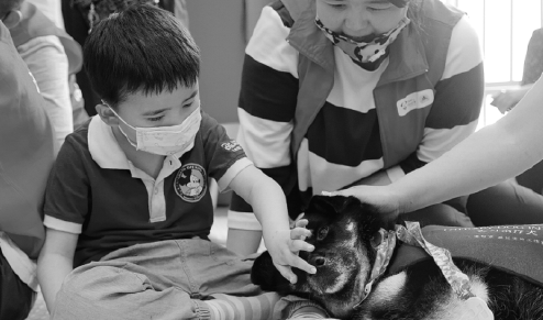 A child touches a dog during an animal-assisted therapy session in Shanghai.[Photo provided to China Daily] |