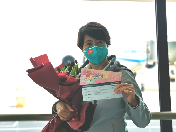 Wang holds a special souvenir air ticket commemorating her fight against COVID-19 at Wuhan Tianhe International Airport before her flight back to Beijing.[Photo provided to China Daily] |