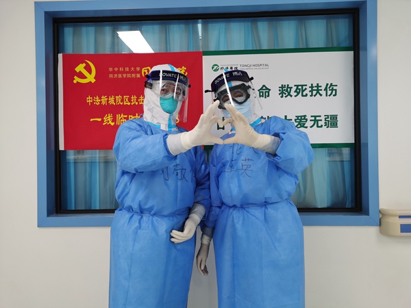 Wang Yuying (right) and a colleague form a heart shape with their hands.[Photo provided to China Daily] |