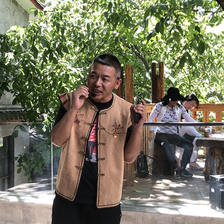 He Xinhai introduces his experience about developing tourist companies to visitors.[Photo by Yang Yang/China Daily] |