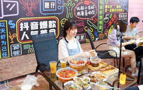 A host eats crawfish while livestreaming the scene at a night market in Shanghai.[Photo provided to China Daily] |
