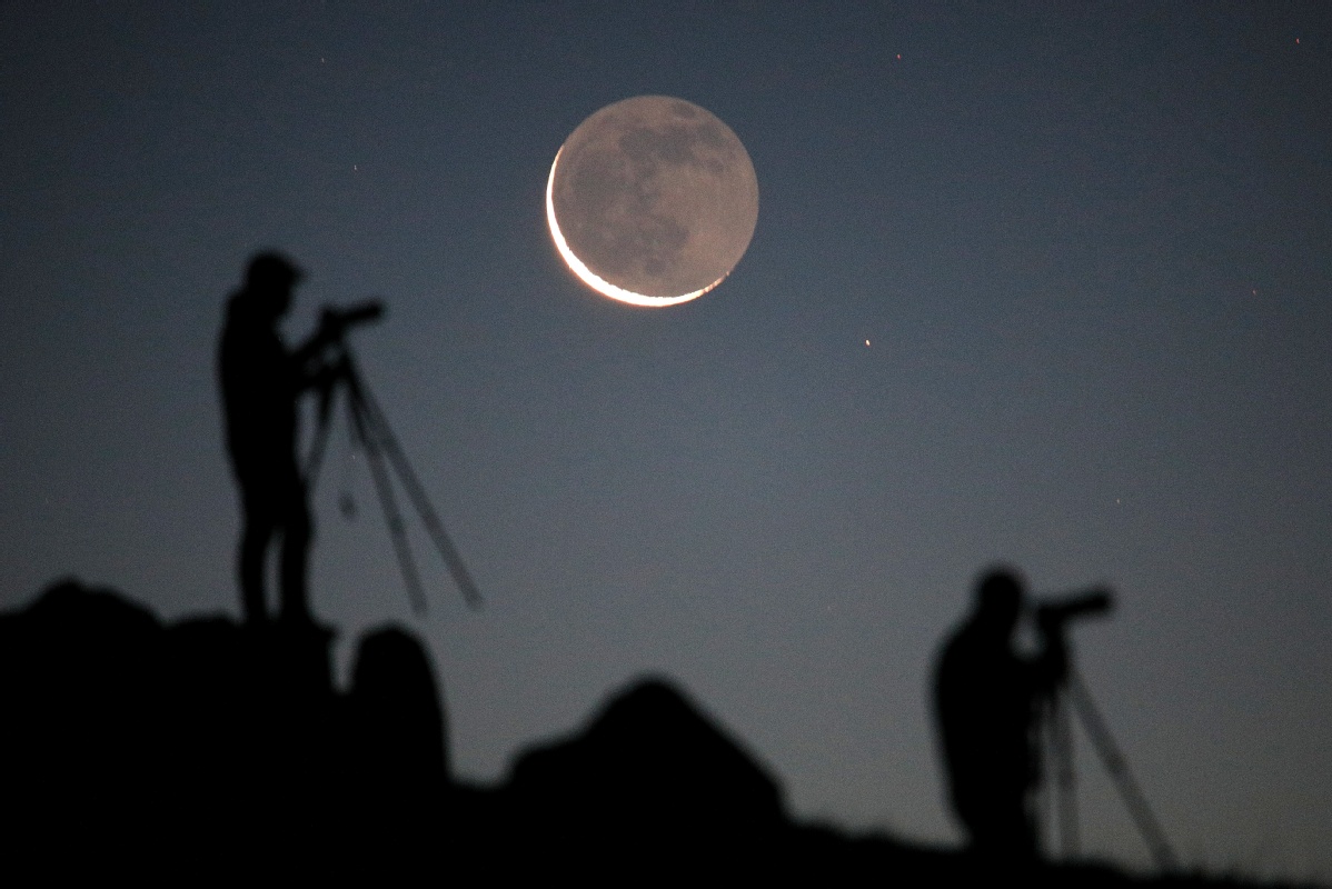 The comet gradually disappears into the morning light before dawn, and the curved waning moon becomes another target for the star chasers.[Photo by Bai Jikai/For China Daily]