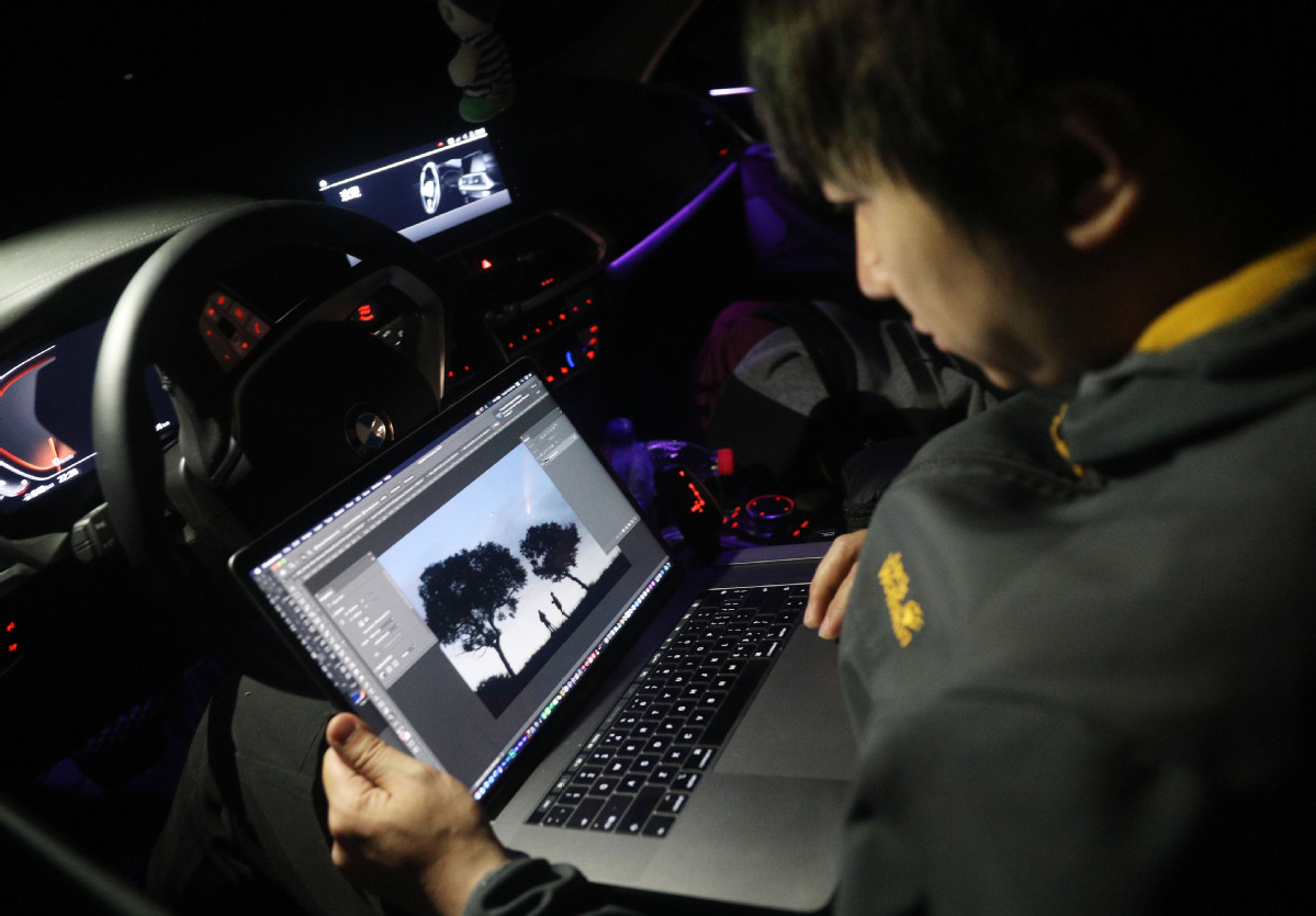 Li edits the comet photos he has just taken in the car.[Photo by Bai Jikai/For China Daily]