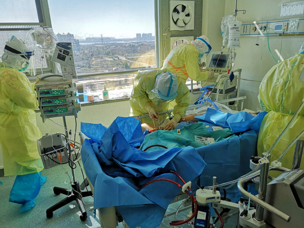 Zhang (center) treats a COVID-19 patient. [Photo provided to China Daily] |