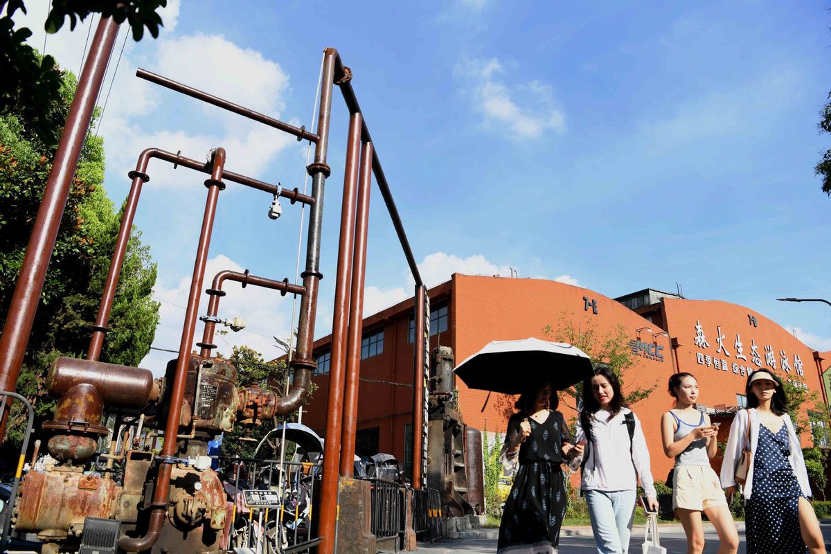 People visit the Yangtze River 180 art district in Hefei, East China's Anhui province, Aug 4, 2020. The Yangtze River 180 art district, a cultural and creative industry park, is transformed from old industrial plants and provides creative office space and leisure destinations.[Photo/Xinhua]