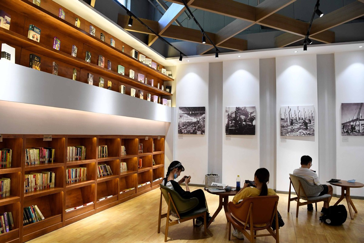People read books at a book store in the Yangtze River 180 art district in Hefei, East China's Anhui province, Aug 4, 2020. The Yangtze River 180 art district, a cultural and creative industry park, is transformed from old industrial plants and provides creative office space and leisure destinations.[Photo/Xinhua]