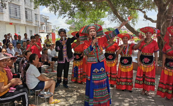 Residents of the Zhuang ethnic group in Helyu village in Laibin, Guangxi Zhuang autonomous region, sing and dance to celebrate their harvest. WANG KAIHAO/CHINA DAILY |