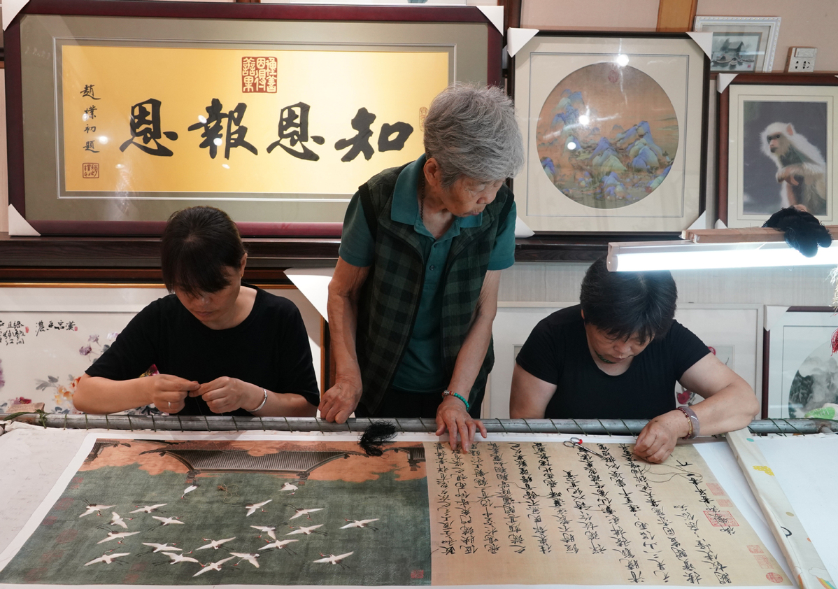 Wang Suhua instructs her students at Suhua Song Embroidery in Kaifeng, Central China's Henan province, on July 30. [Photo/Xinhua]