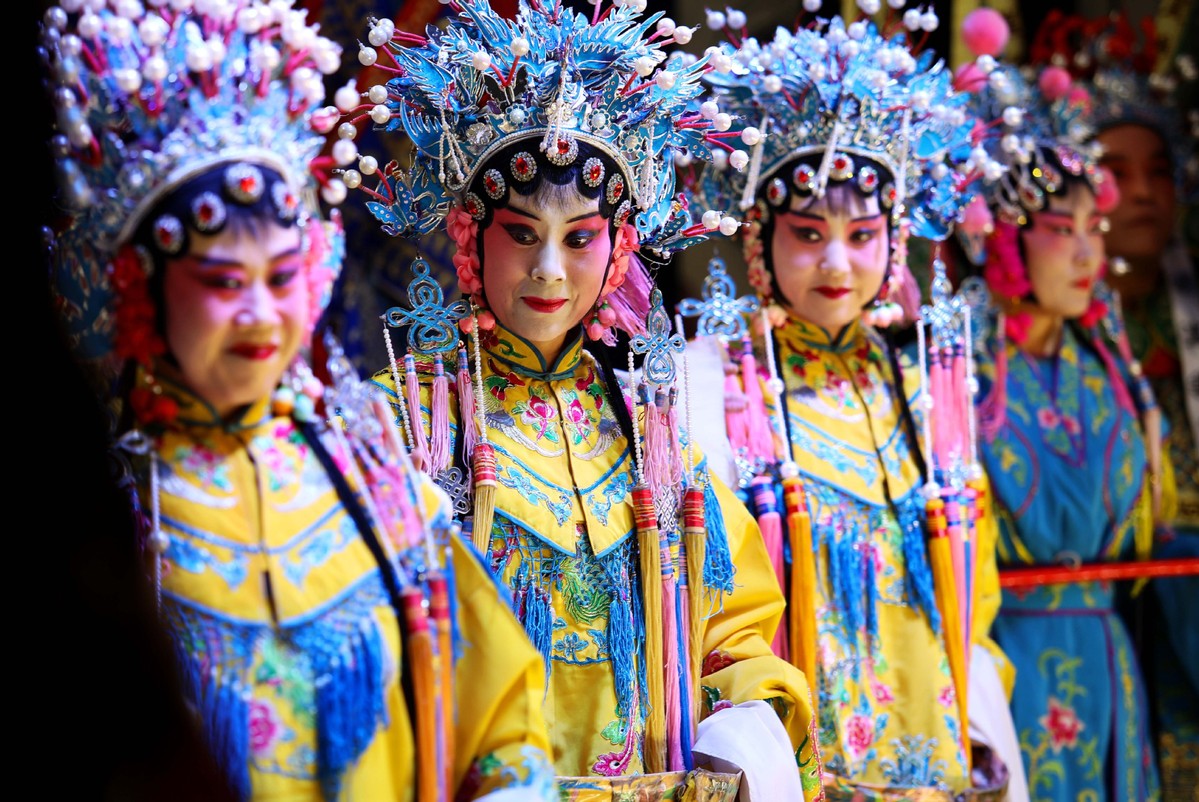 Actresses from a local Jin opera troupe give a performance in Touquan village, Jingxing county, Shijiazhuang city of North China's Hebei province, Aug 5, 2020. The Jingxing Jin opera troupe staged a performance on Wednesday in Touquan village, the first of a series of over 60 touring performances in the rural areas of Shijiazhuang city during the summer holidays.[Photo/Xinhua]