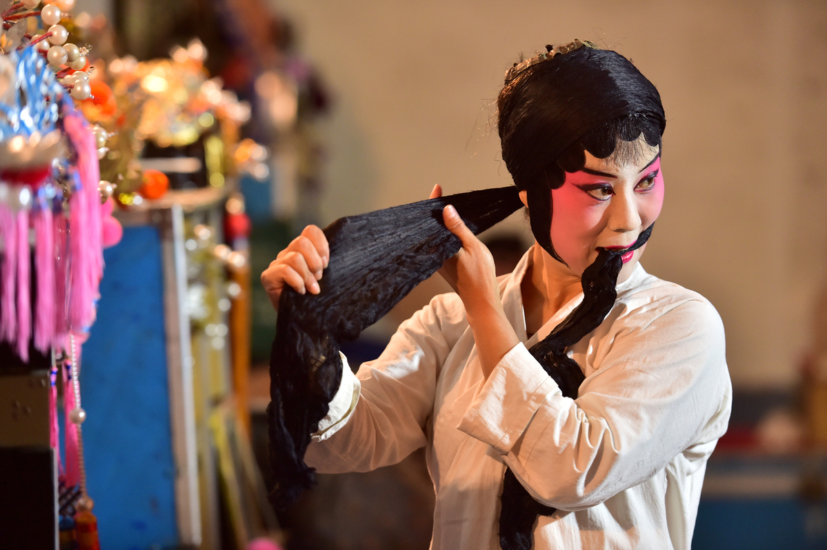 An actress from a local Jin opera troupe prepares for a show in Touquan village, Jingxing county, Shijiazhuang city of North China's Hebei province, Aug 5, 2020. The Jingxing Jin opera troupe staged a performance on Wednesday in Touquan village, the first of a series of over 60 touring performances in the rural areas of Shijiazhuang city during the summer holidays.[Photo/Xinhua]