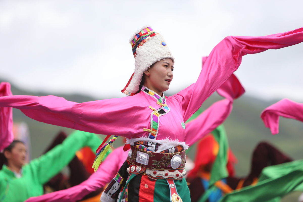 People perform the Guozhuang dance at a local festival in Luqu county, Gannan Tibet autonomous prefecture, Northwest China's Gansu province, Aug 12, 2020. The Guozhuang dance is a favorite collective bonfire dance for Tibetans, allowing them to show respect and reverence for nature.[Photo/Xinhua]