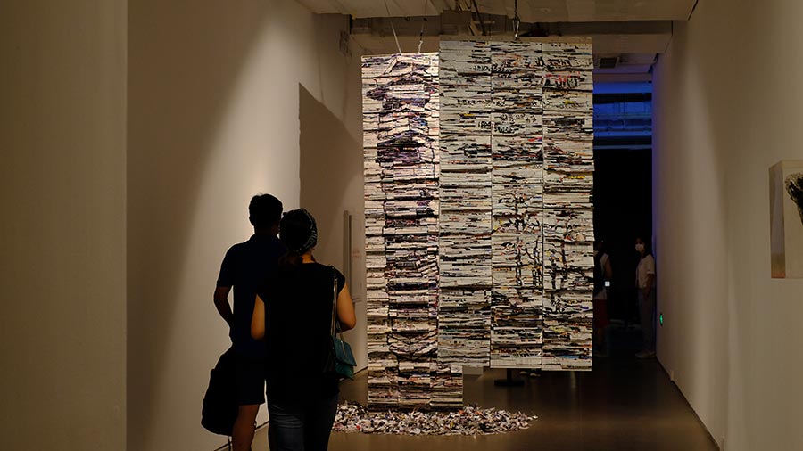Visitors view artist Li Qiang’s Death of Mountain and Library Project No 1 at the Today Art Museum in Beijing on July 25, 2020. [Photo by Yang Xiaoyu/chinadaily.com.cn]