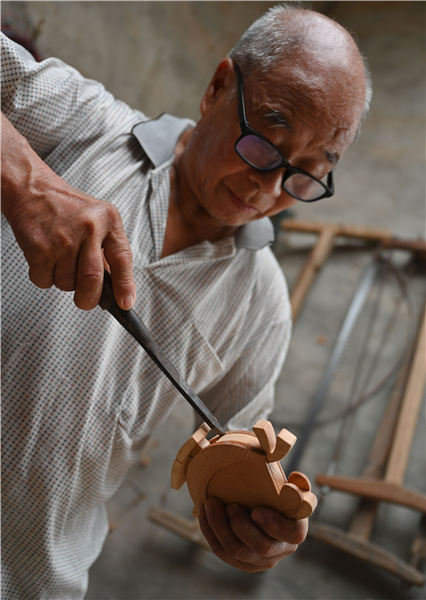 Li Shishui debugs a "self-propelled" toy bird. [Photo/Xinhua]