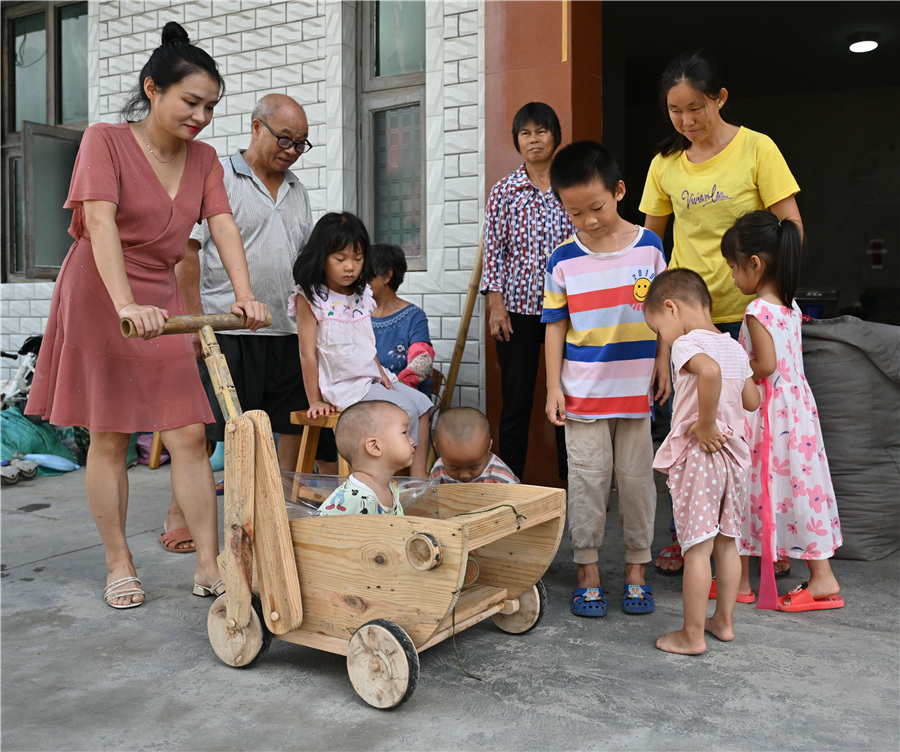 Dandan sits in the "mantis cart" and attracts the attention of the children in the village. [Photo/Xinhua]