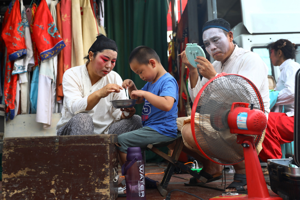 Ma Xinhua (R) prepares for a show as his wife Li Fengmin (L) , also a member of a traditional Yu Opera troupe, takes care of their grandson in East China's Anhui province, Aug 14, 2020. The local Yu Opera troupe formed by 25 villagers tours among villages of Nanping and Shuangdui townships to entertain the villagers with live performances.[Photo/Xinhua]