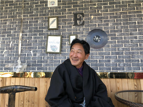 Guru Tashi in his yard tells the story about how he opened the first cafe in Gaxiu village. [Photo by Yang Yang/China Daily] |