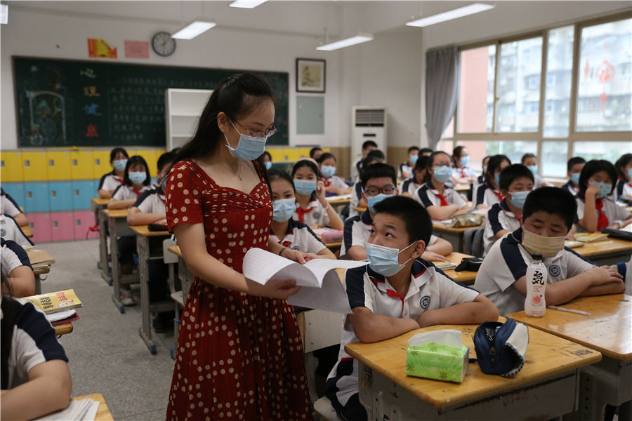 The first-and second-year students at Shuiguohu No 1 Middle School in Wuhan resume classes on Aug 10. [Photo by Wu Xiaohui/China Daily]
