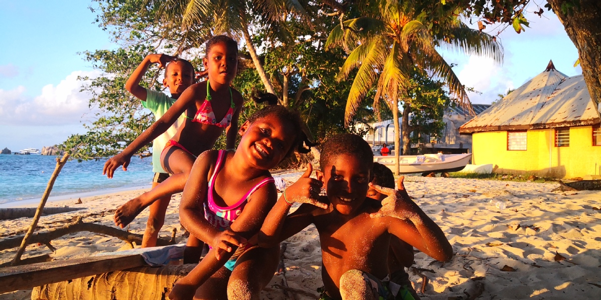 Children on a beach of La Digue Island smile at Yang while he's taking this photo. [Photo by Yang Zhouhu/China Daily] |