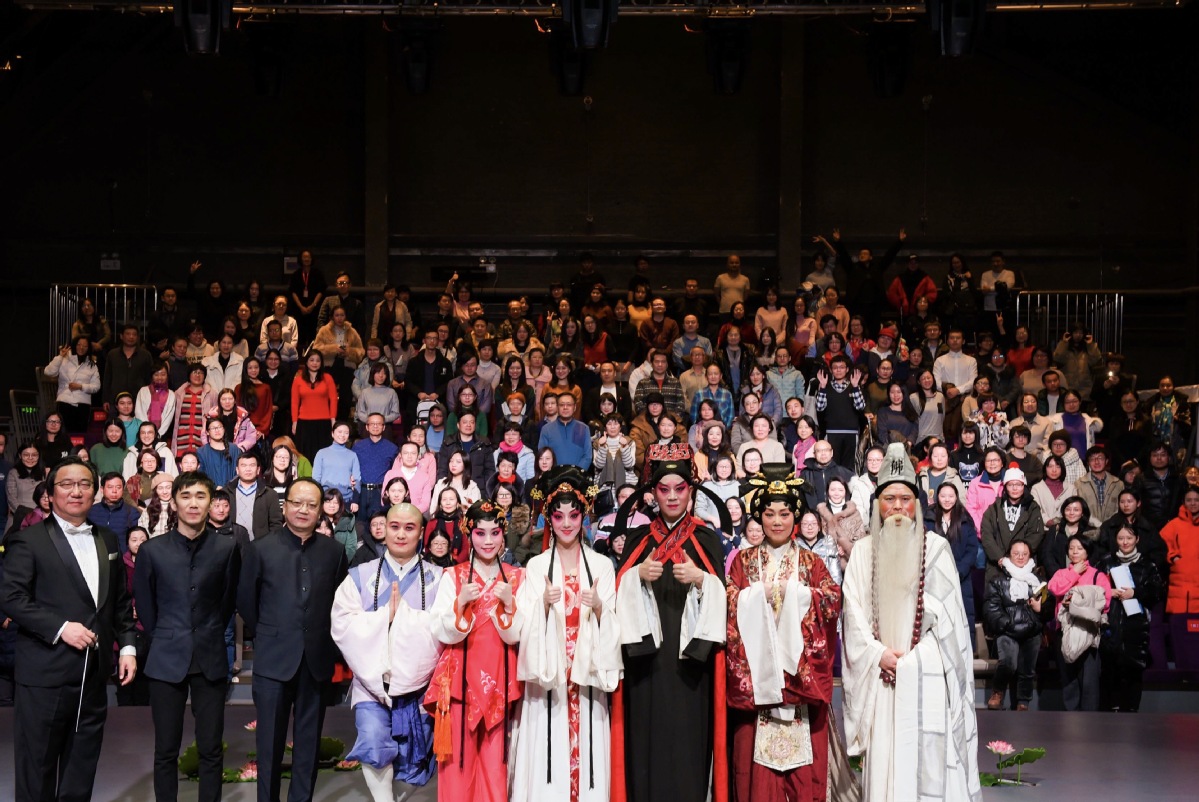 Performers take photos together with the audience at Langyuan Vintage Creative Art Zone after the Kunqu Opera Romance of the Western Chamber. [Photo provided to China Daily] |