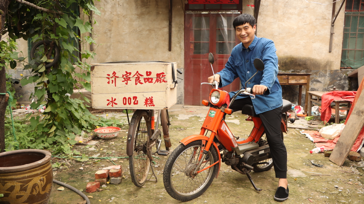 He is on an old motorbike in his courtyard home in Jining, Shandong province, beside an old bike refitted to sell popsicles. [Photo provided to China Daily] |