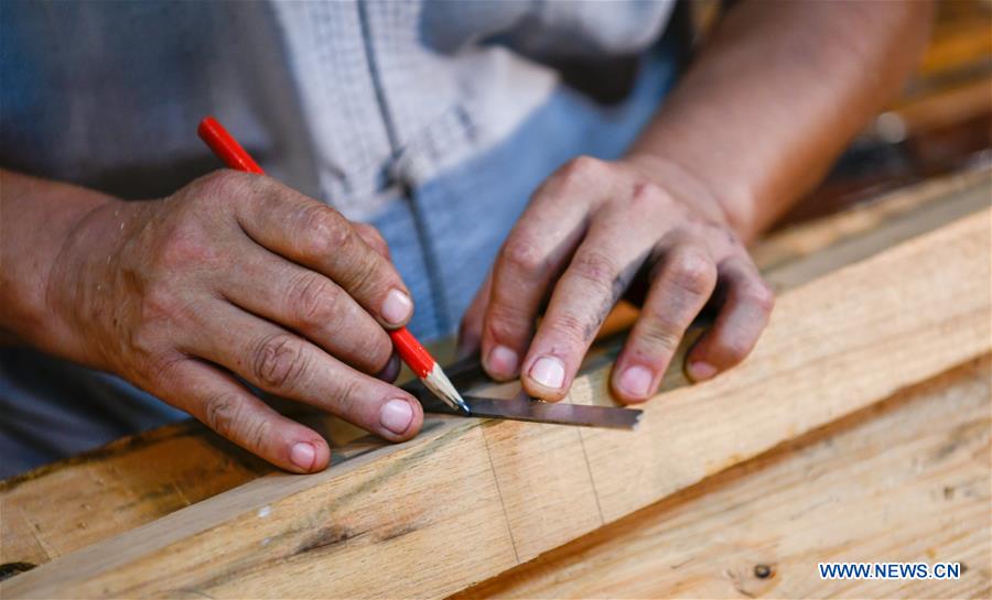 Xin Quansheng draws lines on a piece of wood at his workshop in Tianjin Vocational Institute, in North China's Tianjin, Aug. 25, 2020. Following the advice of his father, Xin Quansheng started to learn woodworking at the age of 16. Now an intangible heritage inheritor, Xin was once a carpenter for over four decades. During his career, Xin has witnessed both encouraging and frustrating periods of the industry. Nevertheless, he could never forget the feeling of being a carpenter even after he changed his occupation at the hardest time. In September 2019, Xin was invited to teach mortise and tenon techniques and wooden furniture making skills at Tianjin Vocational Institute, which gives him a new opportunity to promote and carry forward the traditional woodworking skills. By far, nearly 100 people from different walks of life have learnt from him.[Photo/Xinhua] |