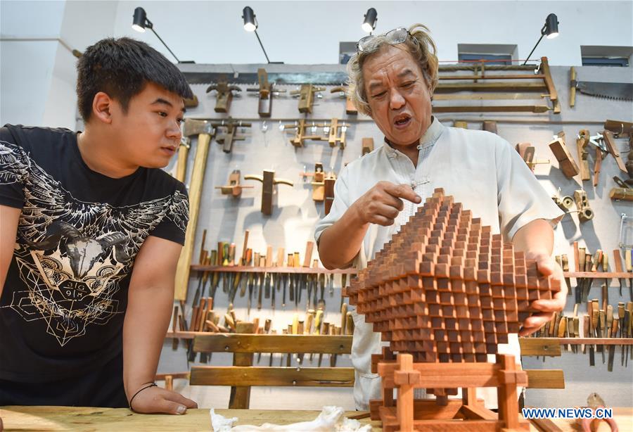 Xin Quansheng teaches an apprentice about a wooden structure at his workshop in Tianjin Vocational Institute, in North China's Tianjin, Aug. 25, 2020. Following the advice of his father, Xin Quansheng started to learn woodworking at the age of 16. Now an intangible heritage inheritor, Xin was once a carpenter for over four decades. During his career, Xin has witnessed both encouraging and frustrating periods of the industry. Nevertheless, he could never forget the feeling of being a carpenter even after he changed his occupation at the hardest time. In September 2019, Xin was invited to teach mortise and tenon techniques and wooden furniture making skills at Tianjin Vocational Institute, which gives him a new opportunity to promote and carry forward the traditional woodworking skills. By far, nearly 100 people from different walks of life have learnt from him.[Photo/Xinhua]